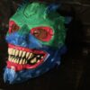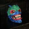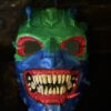 A striking hand-painted 3D printed demon mask featuring vivid neon colors, glowing effects, and aggressive sculpted teeth. Designed as a unique collectible art piece perfect for display, cosplay, or horror-themed décor.
