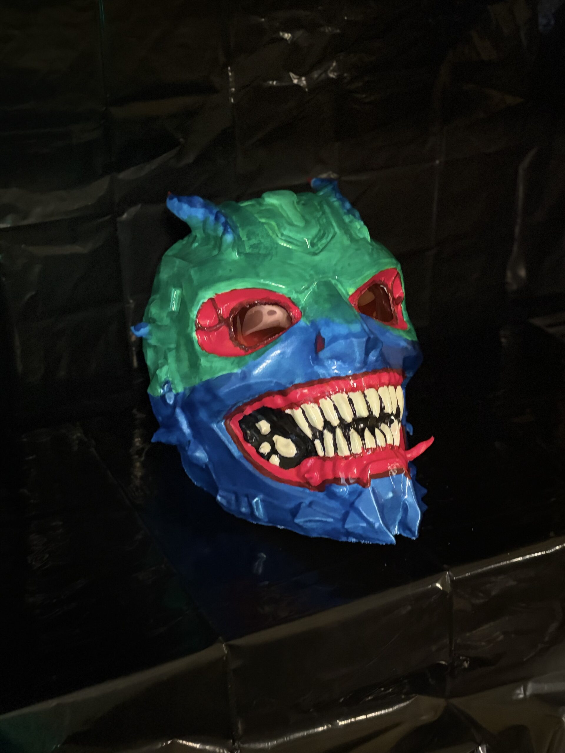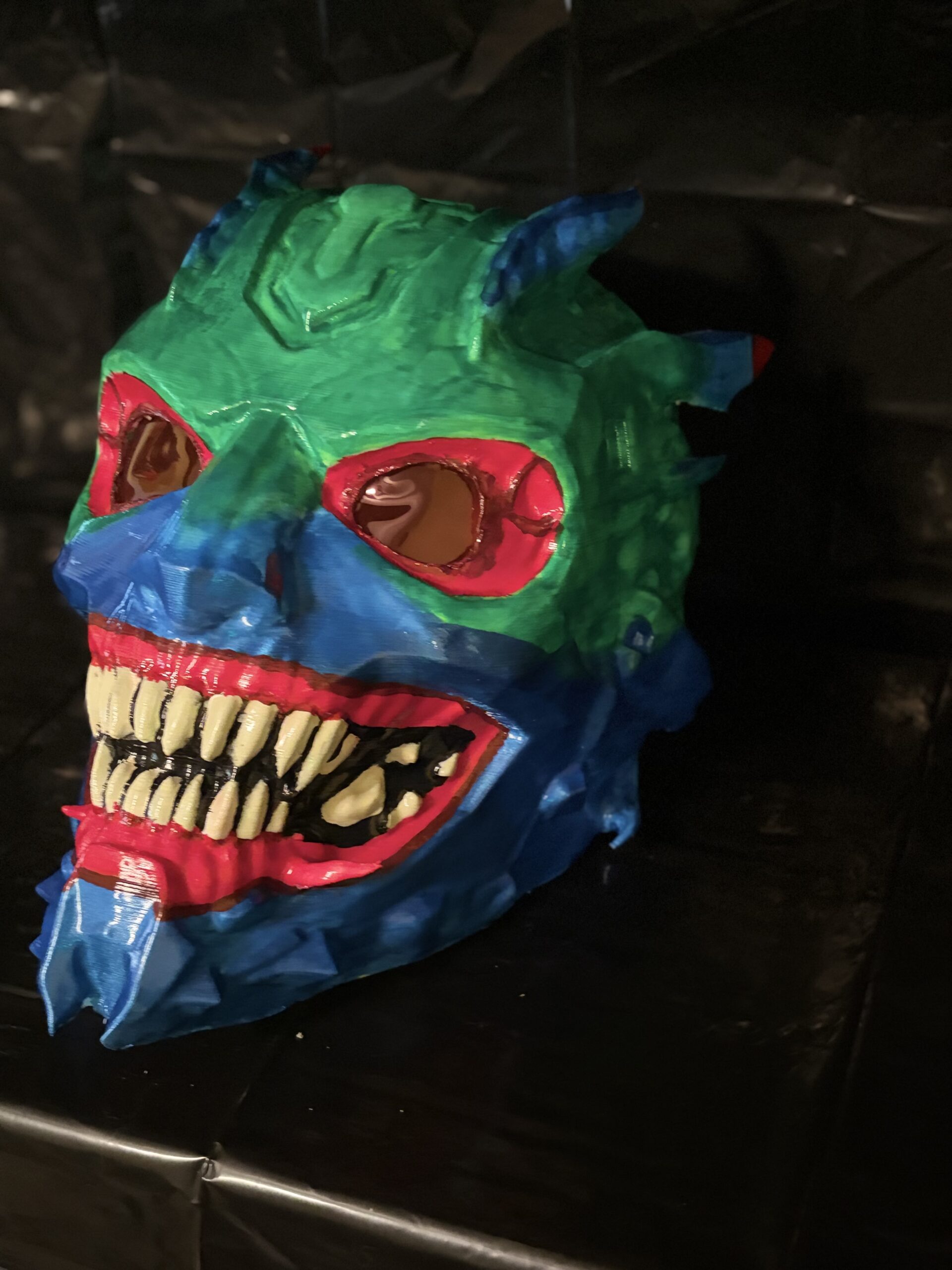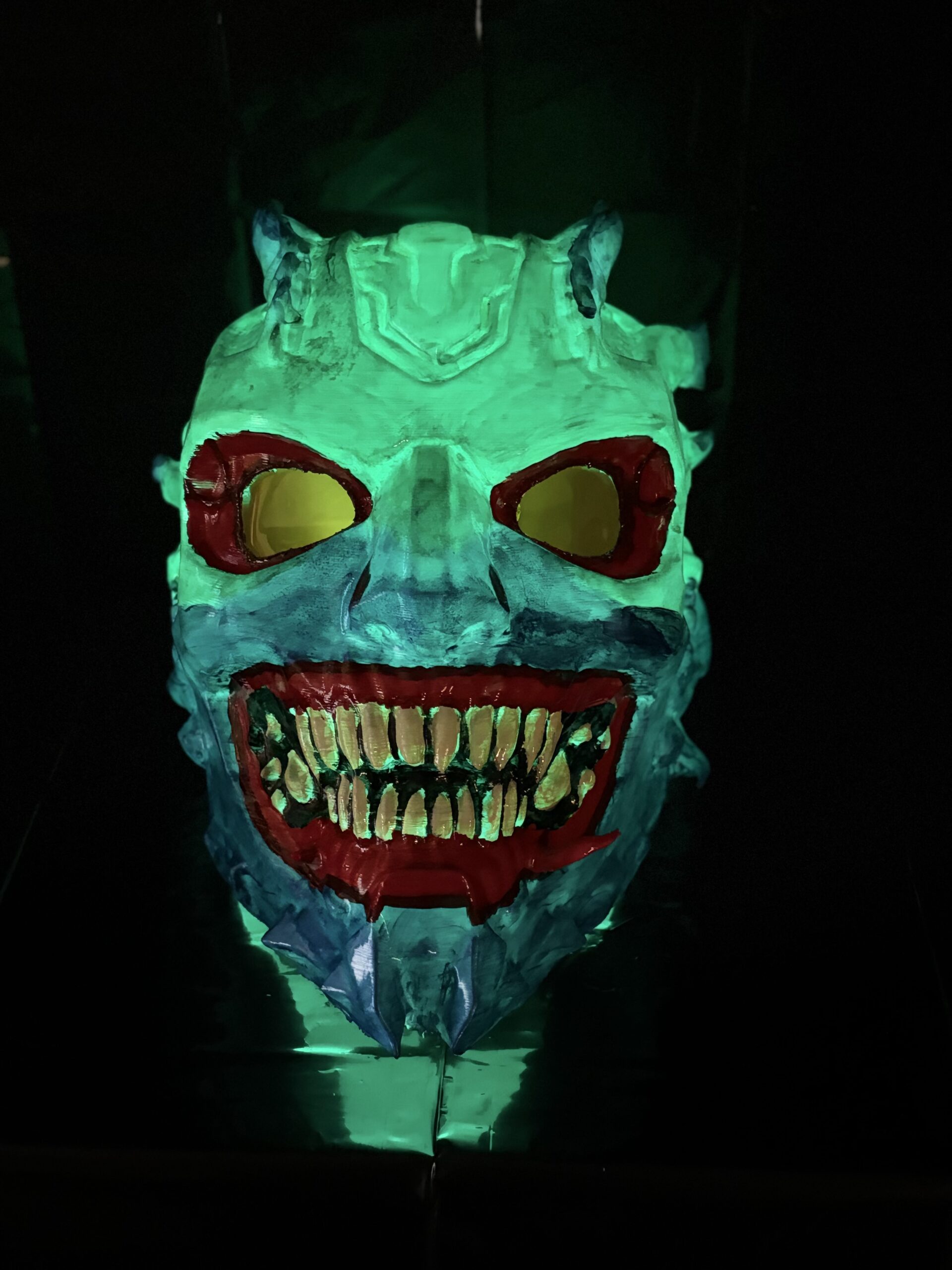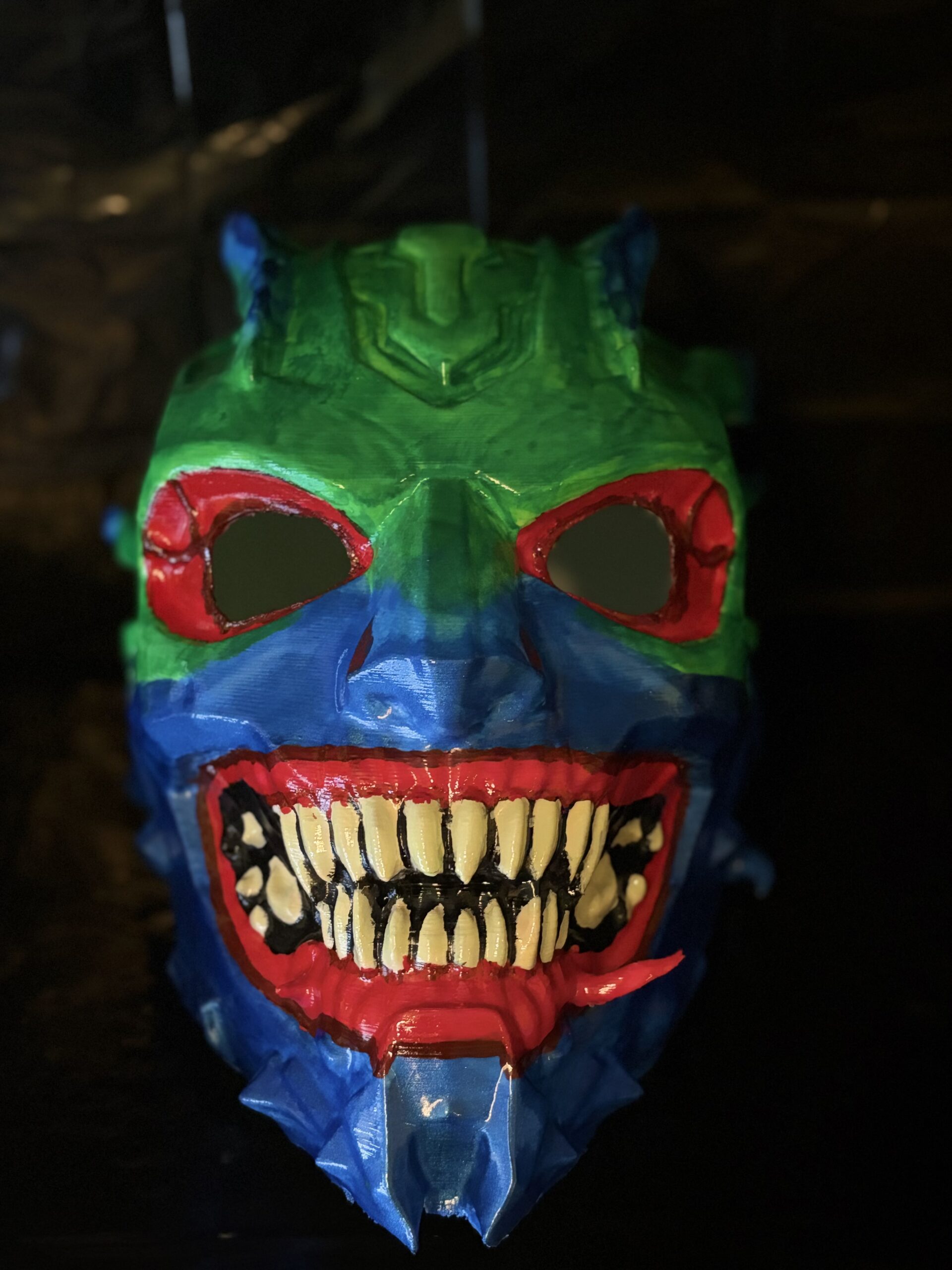 Each piece is 3D printed and individually hand-painted, making every mask slightly unique. The vibrant color palette—deep blues, toxic greens, and blood-red accents—creates a dramatic contrast that becomes even more powerful under low lighting.