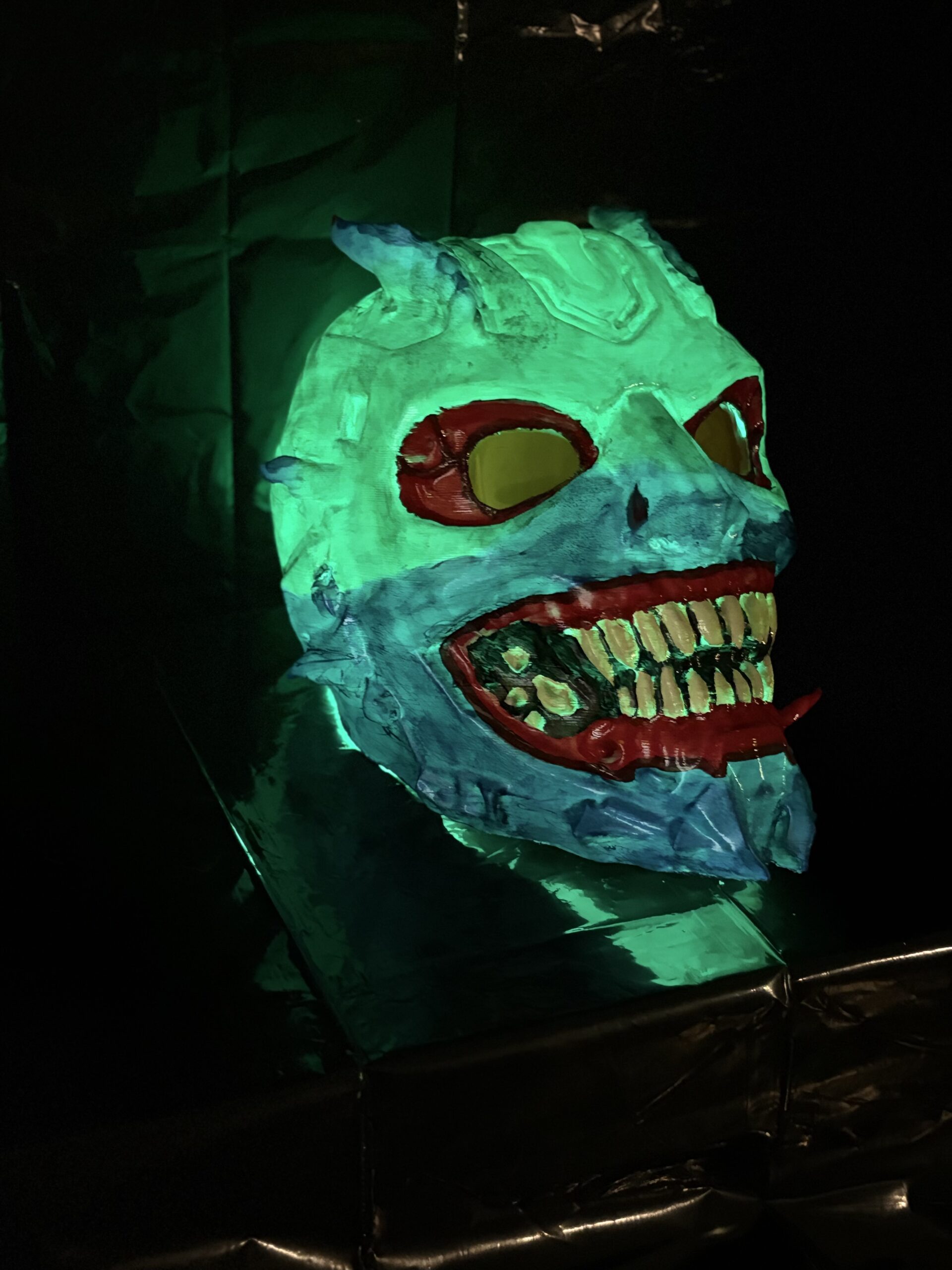The sculpted teeth and sharp facial details give the mask a sinister personality, while the textured surface highlights the craftsmanship of the printed structure. When illuminated, the mask produces a striking glow effect that transforms it into an eye-catching centerpiece.